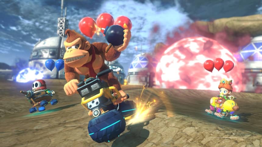 Launches your vehicle into the air, avoiding bananas and shells. Hit an opponent during a jump to steal one of their balloons.